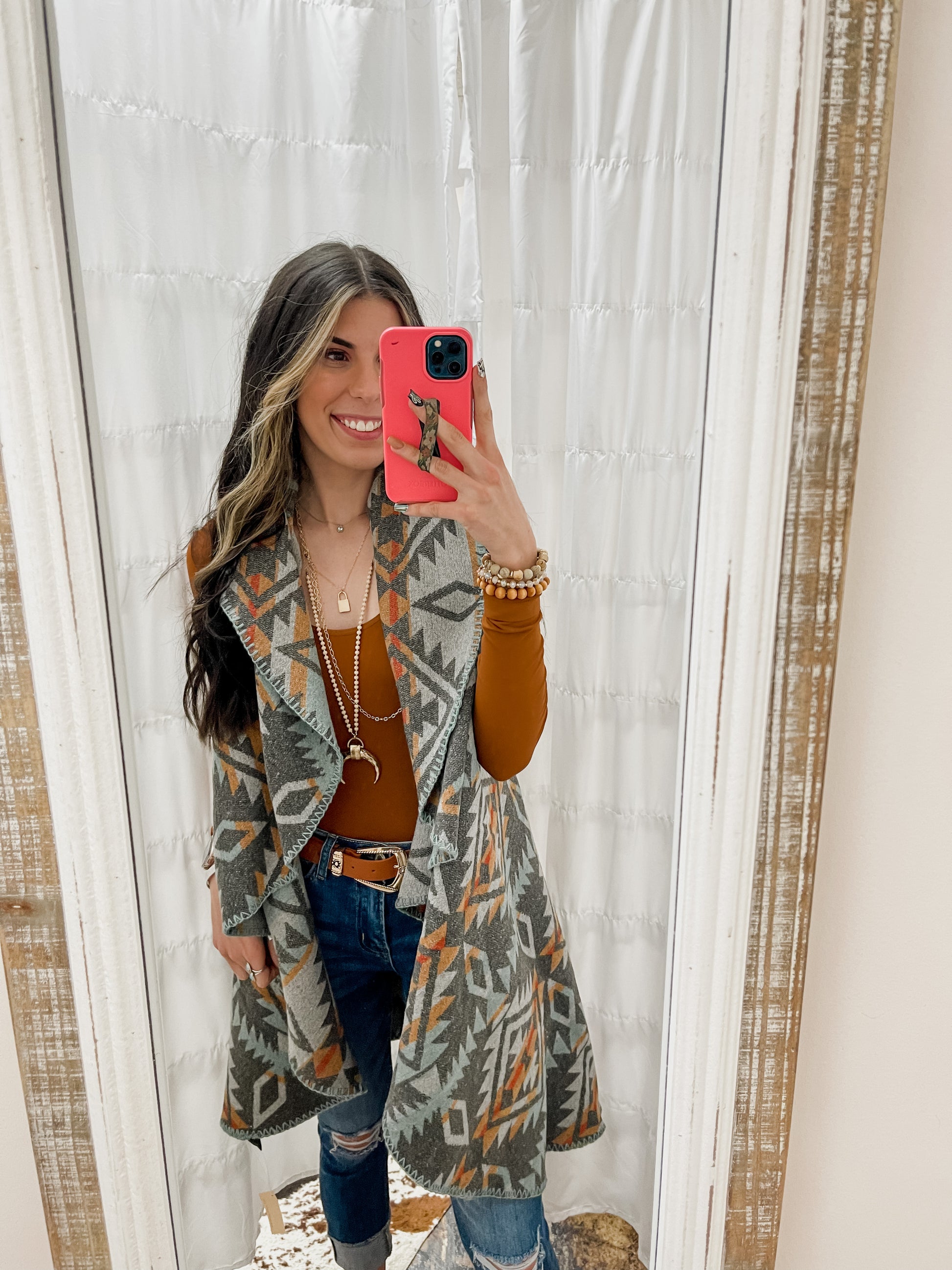 This beautiful western themed vest design gives you the ability to highlight and/or contrast with many different outfits. Pairs well with jeans and a long sleeve top or bodysuit.
