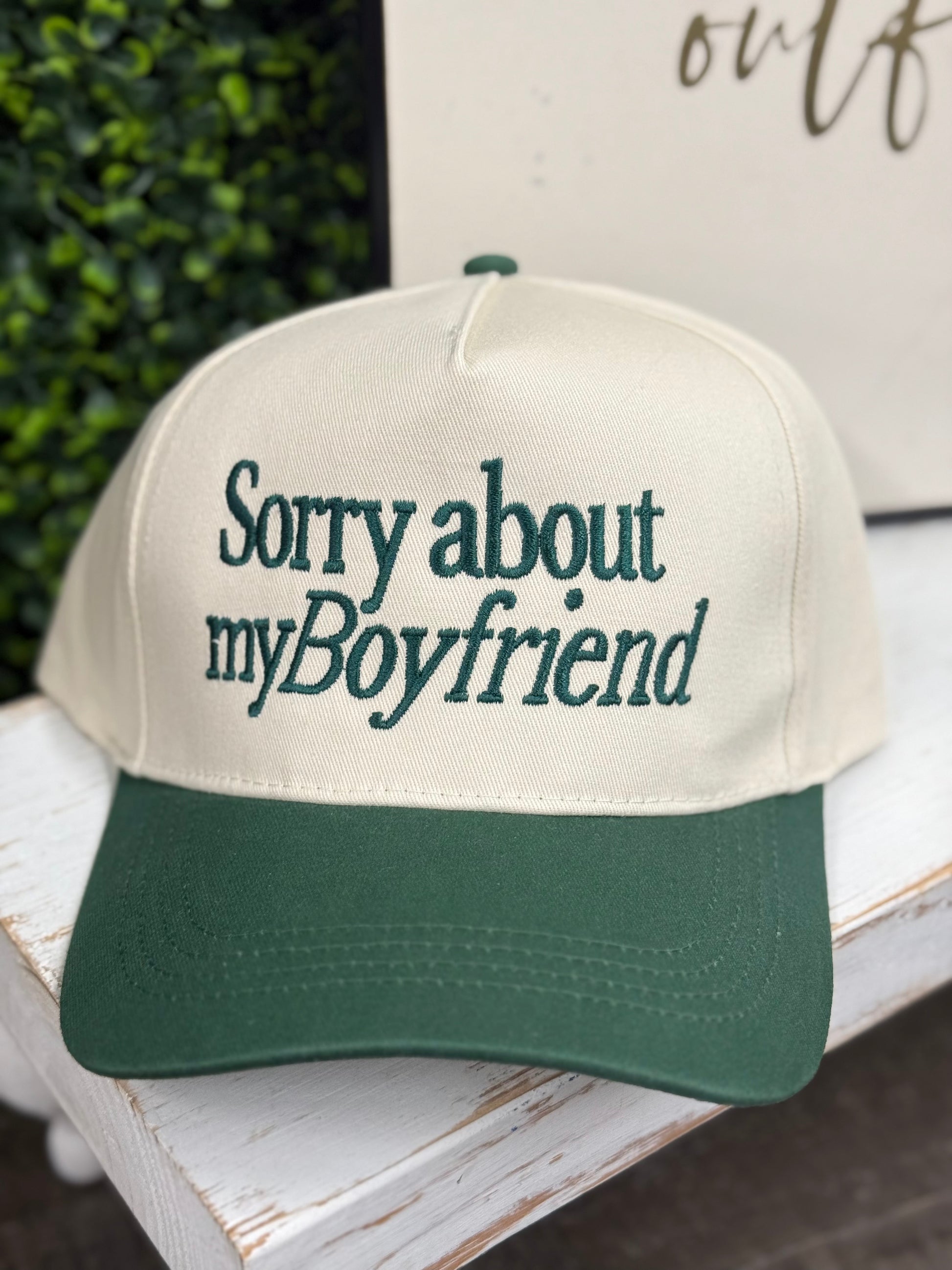 Say "sorry" in style with The Sorry About My Boyfriend Hat. This quirky and playful hat features a bold embroidered message, adding a touch of humor to any outfit. Perfect for those who don't take themselves too seriously, this hat is sure to be a conversation starter.