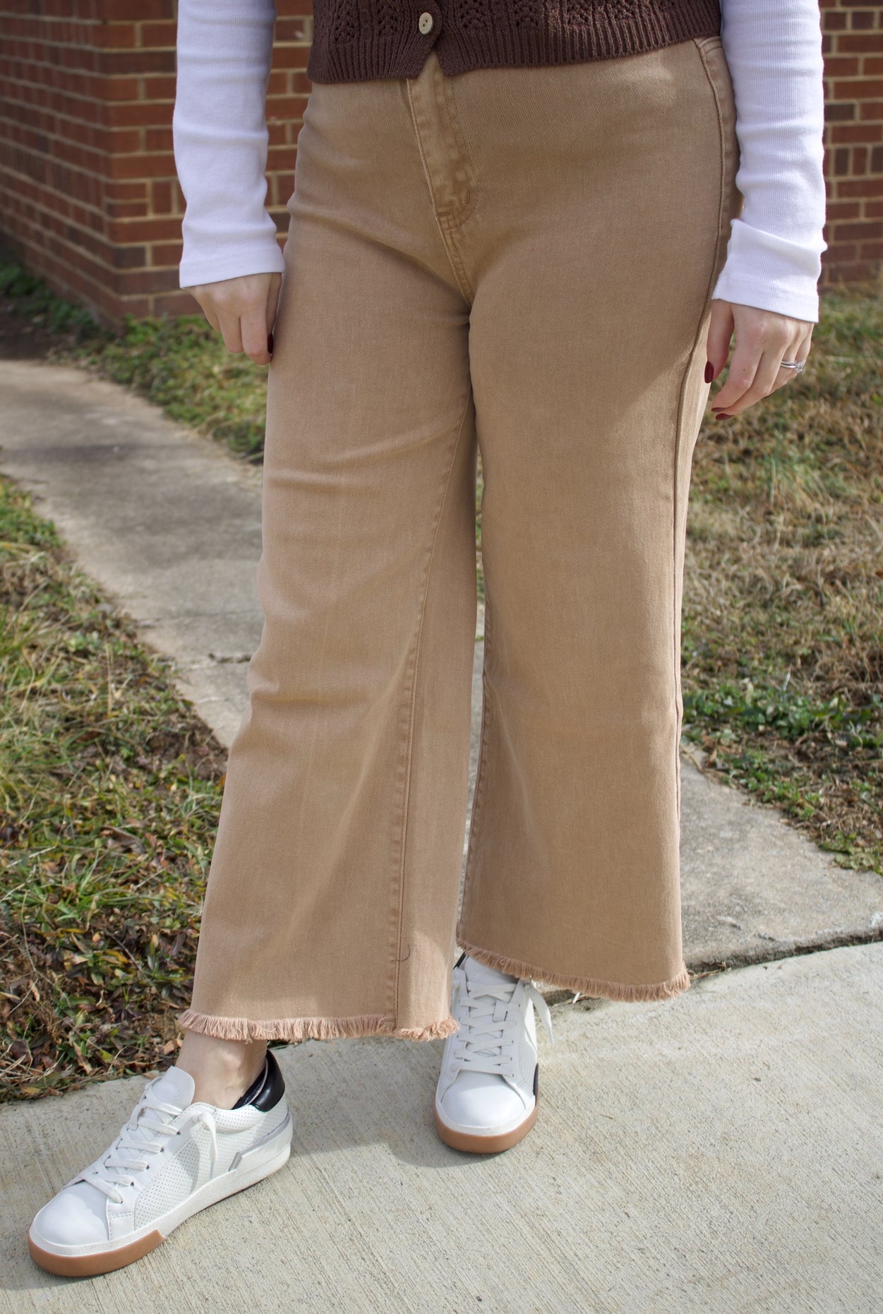 Expertly crafted with a trendy acid wash finish, these cropped pants are a must-have for any wardrobe. The raw hem adds an edge to the cropped length, making these pants a versatile and stylish choice. Elevate your look with the Tenille Acid Wash Cropped Pants in brush.