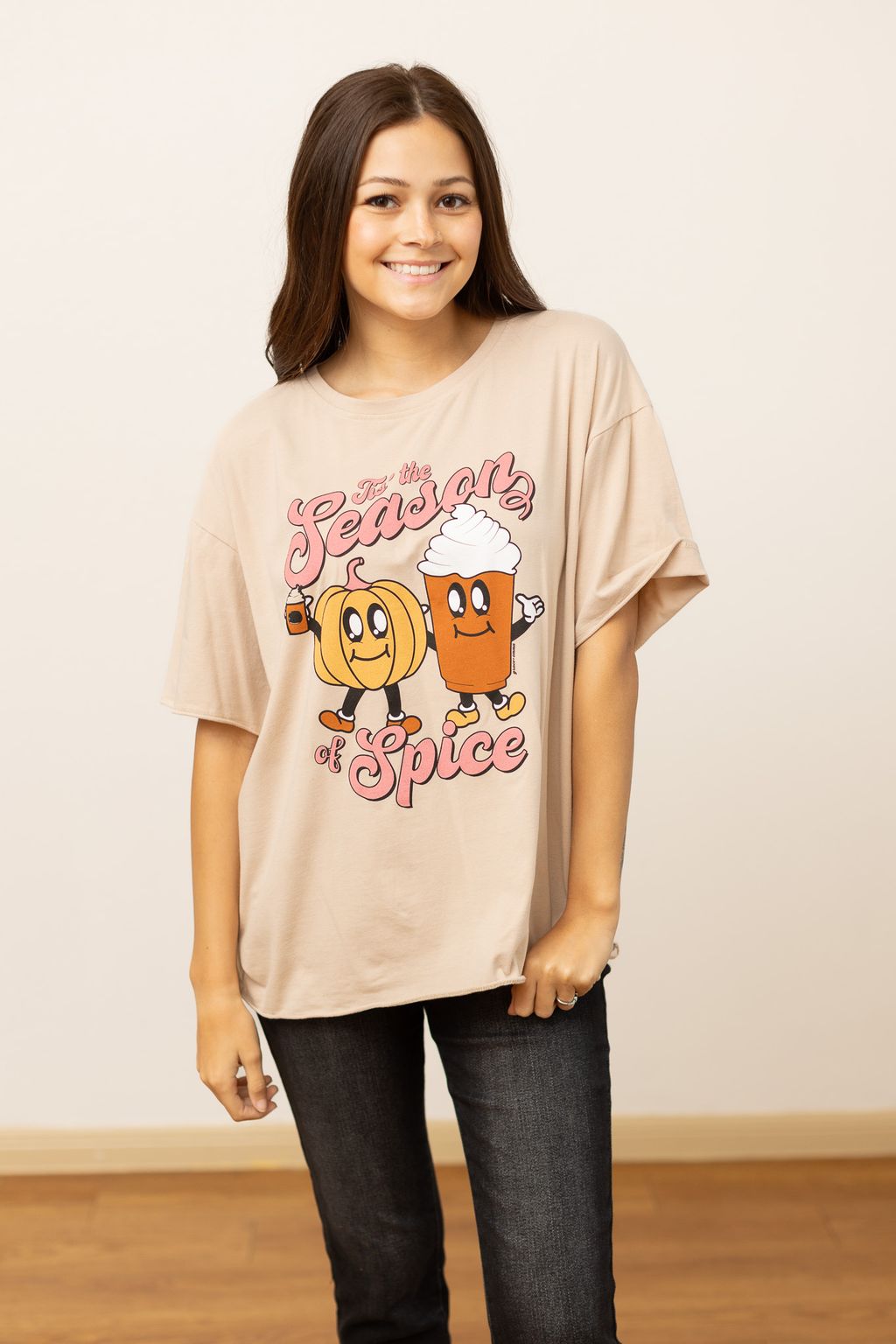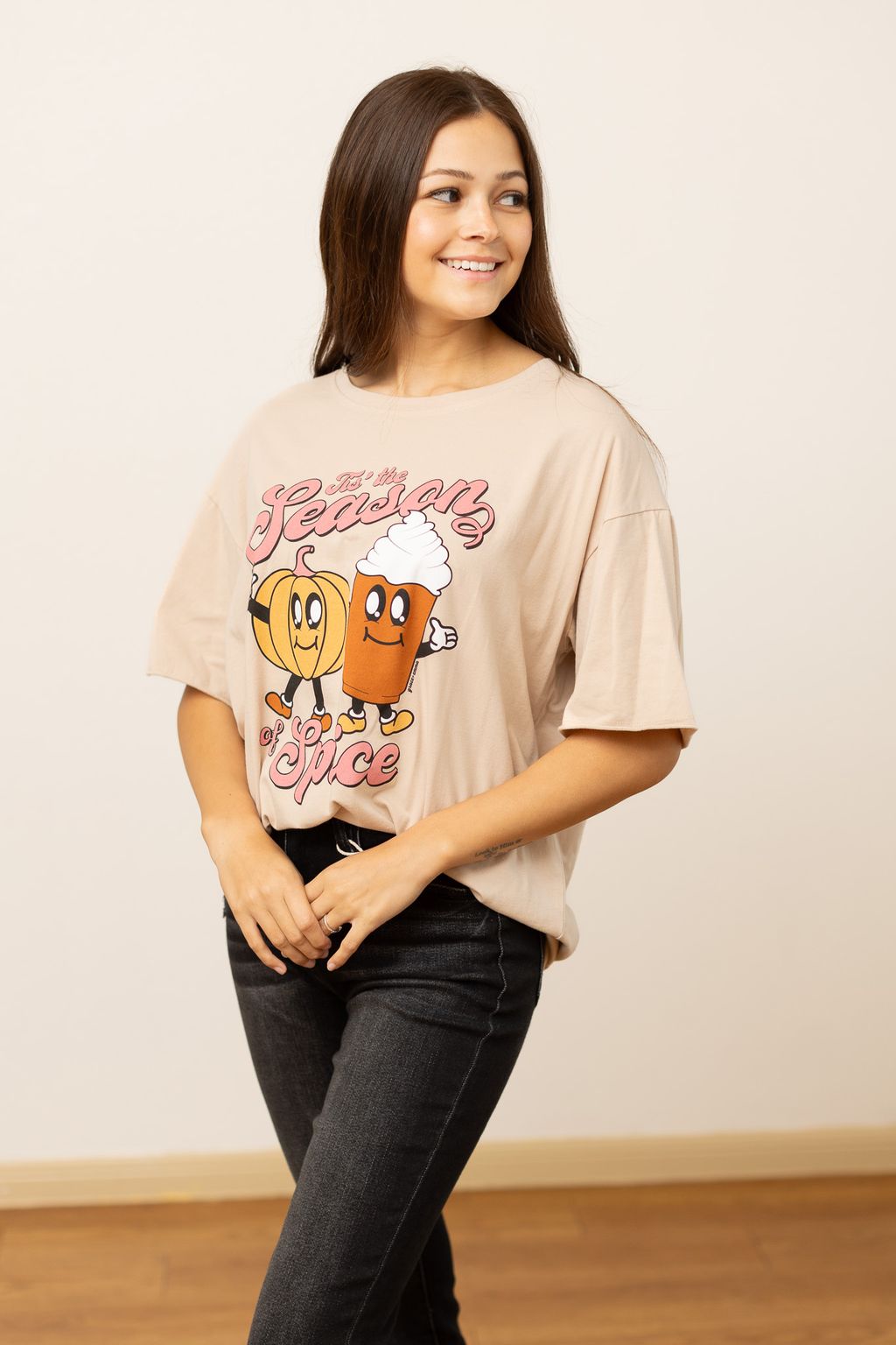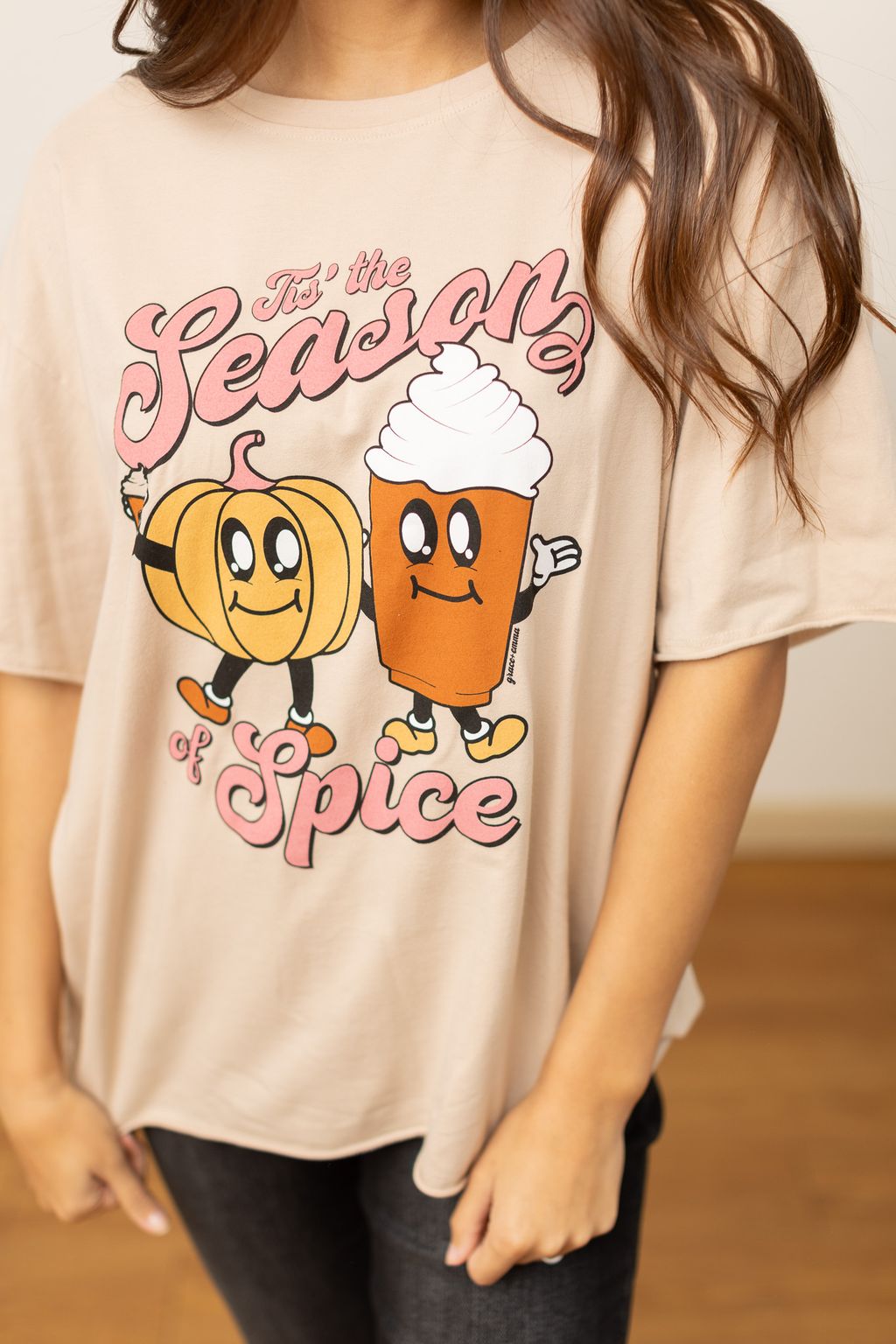 The "Tis The Season" Beige Tee Shirt features a festive graphic, perfect for celebrating the season in style. Made from soft, comfortable fabric, it offers a relaxed fit and casual elegance.