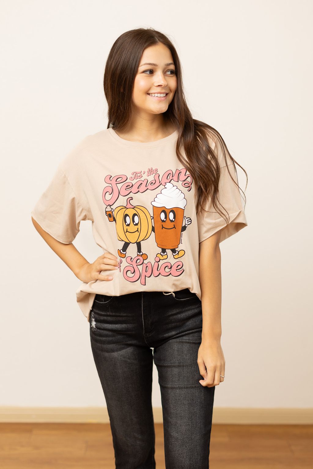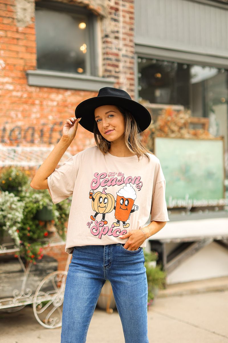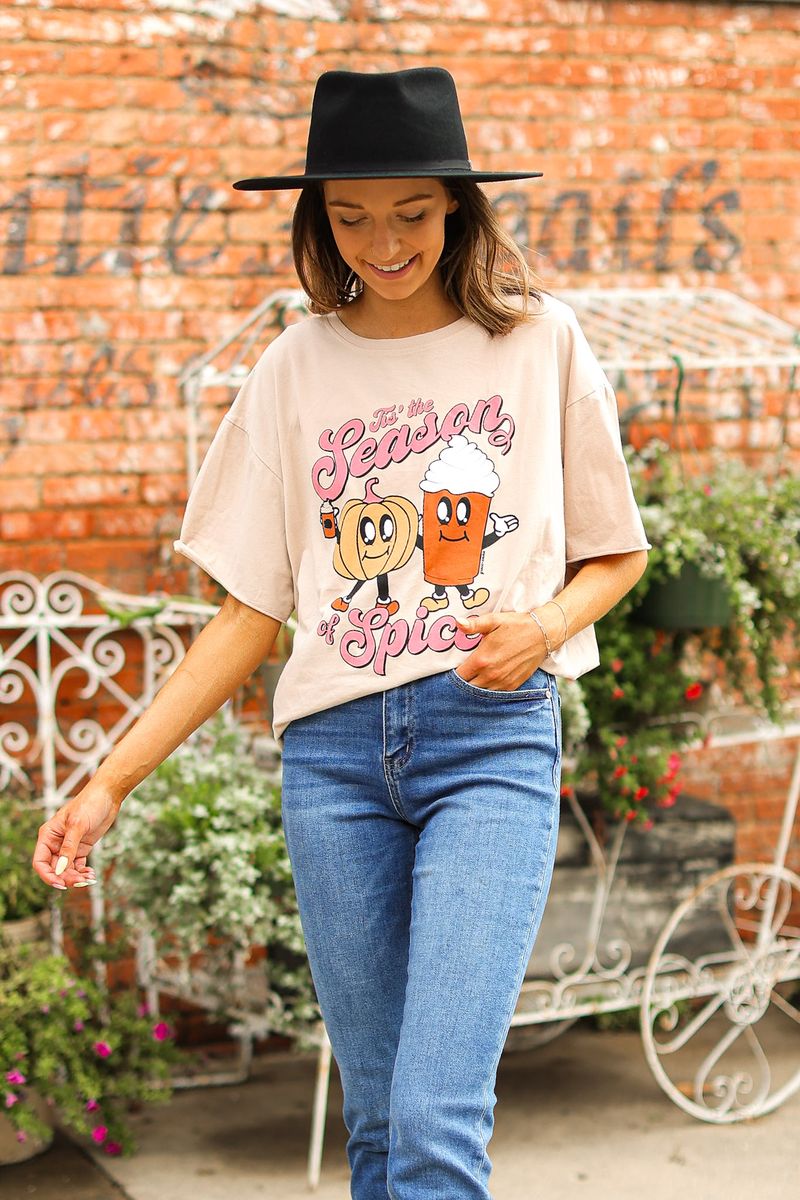 The "Tis The Season" Beige Tee Shirt features a festive graphic, perfect for celebrating the season in style. Made from soft, comfortable fabric, it offers a relaxed fit and casual elegance.