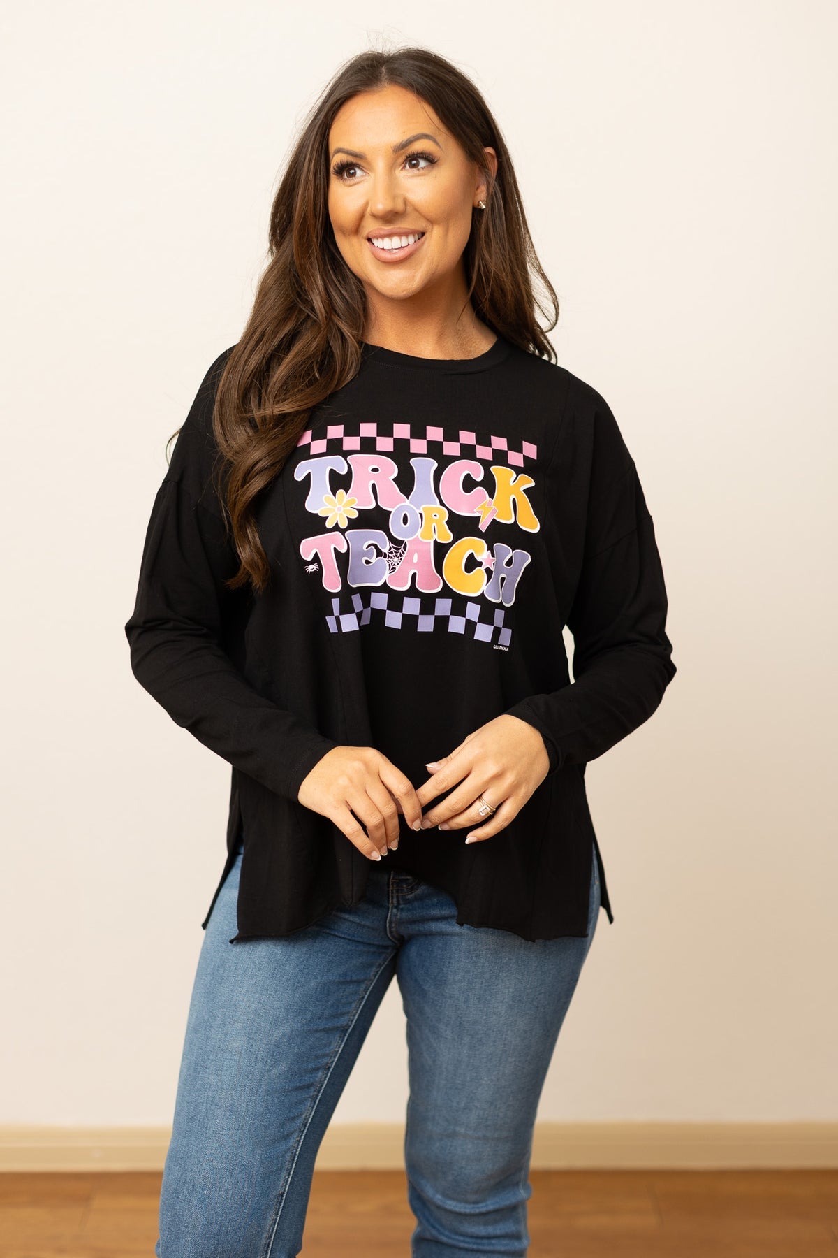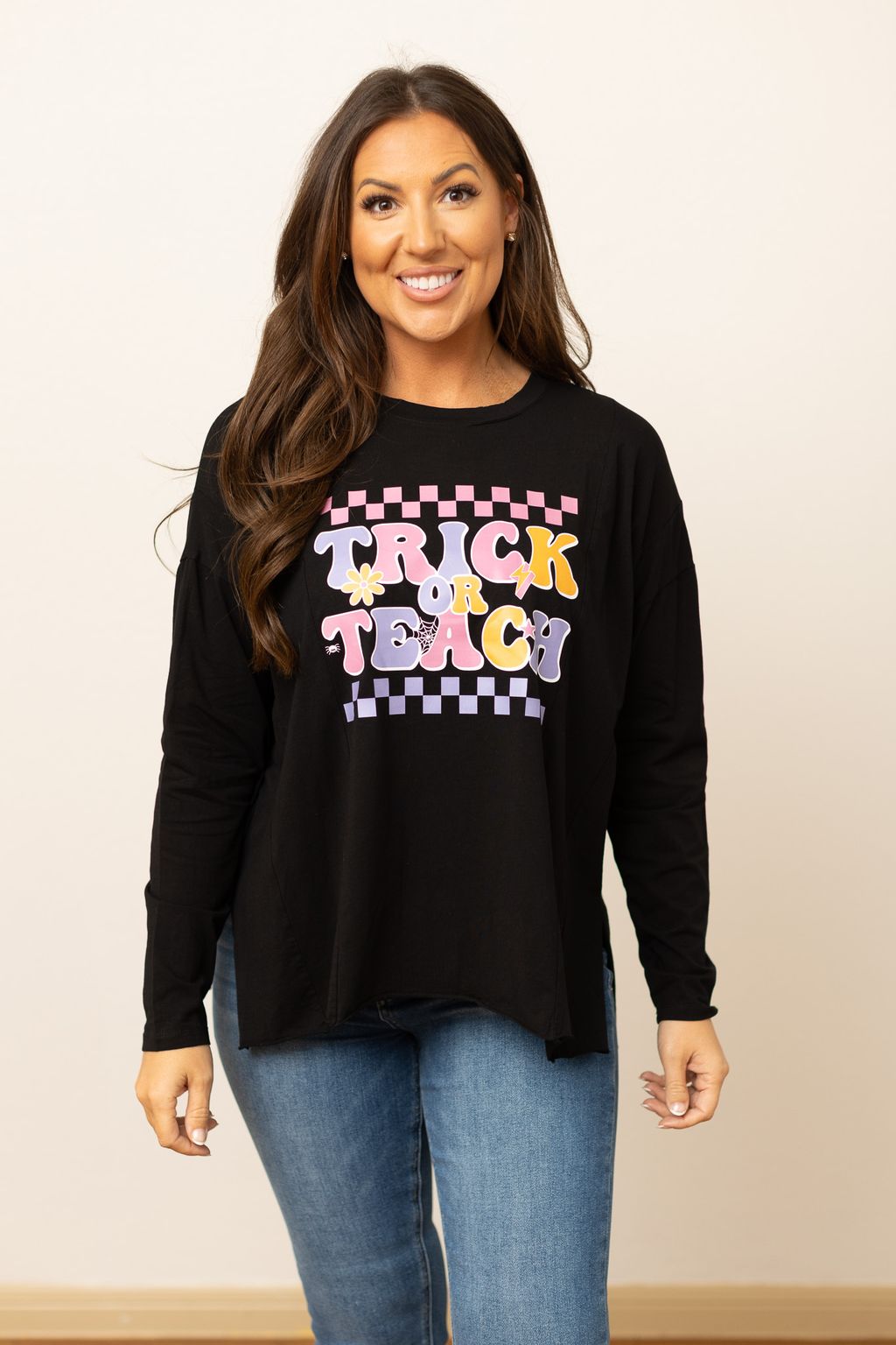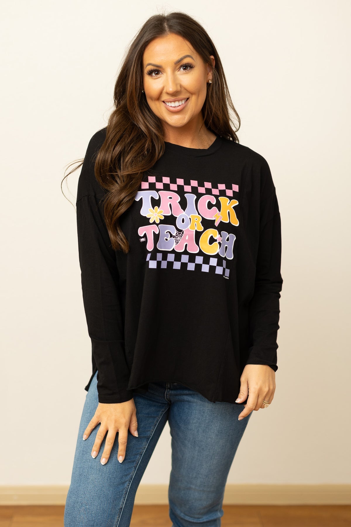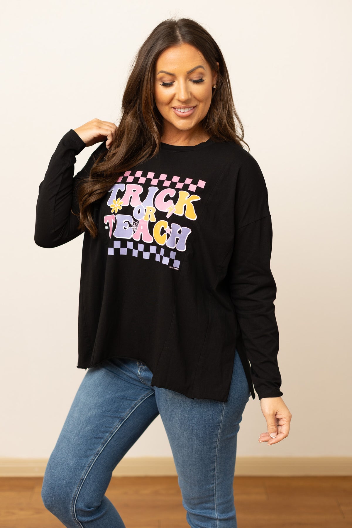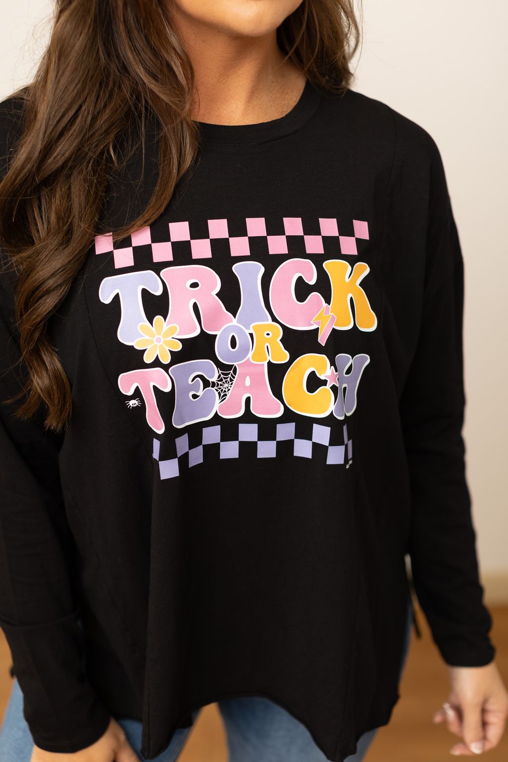 Get spooky and stylish with our Trick or Teach Long Sleeve Tee. Perfect for Halloween, this checkered tee will have you looking like a ghostly teacher (or trickster) in no time. Get ready to spook and school in style!