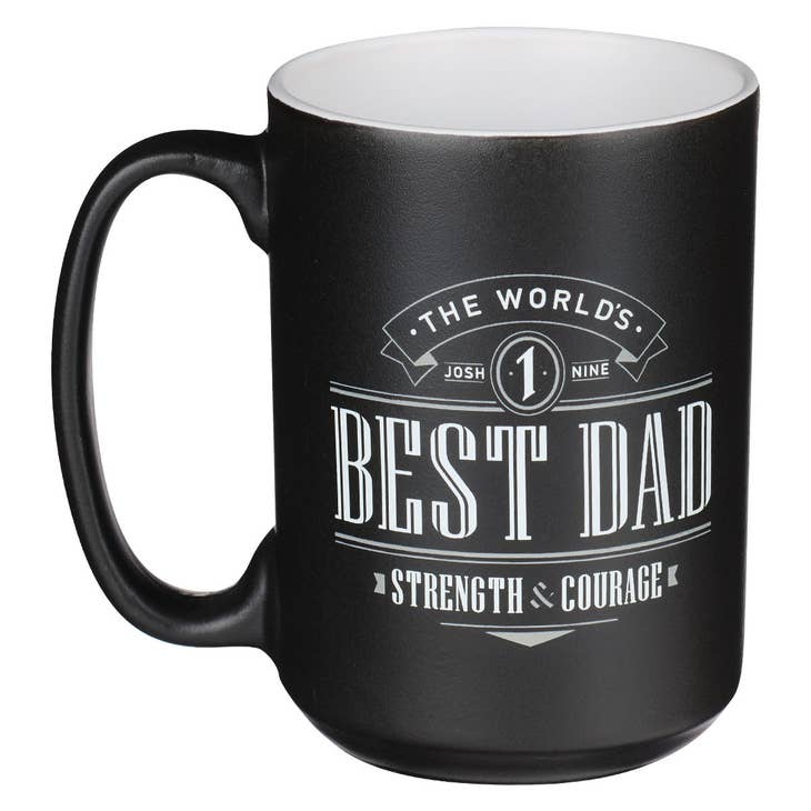 The exterior of this sturdy ceramic cup is a solid black contrasted with a crisp white interior. White lettering in a collegiate style design spells out the sentiment.The World's Best Dad Strength & Courage Joshua 1:9 The mug itself is as strong as a father's love with a wide mouth and easily graspable handle, and at a generous 14 fluid ounce capacity, it can quench any man's thirst.