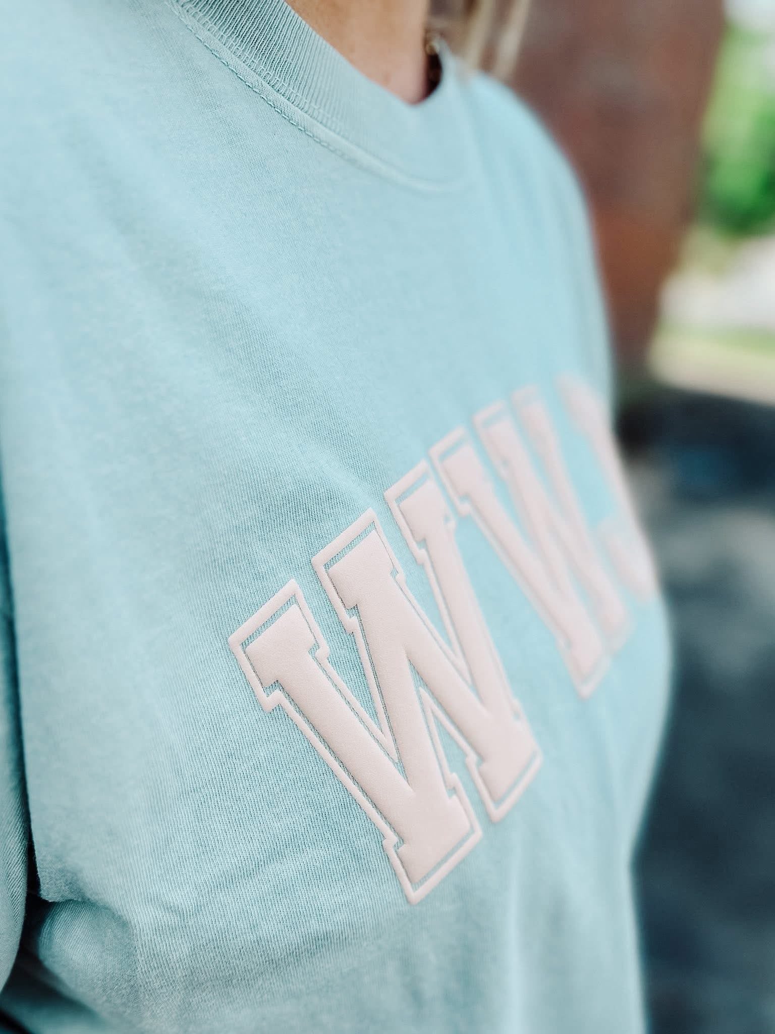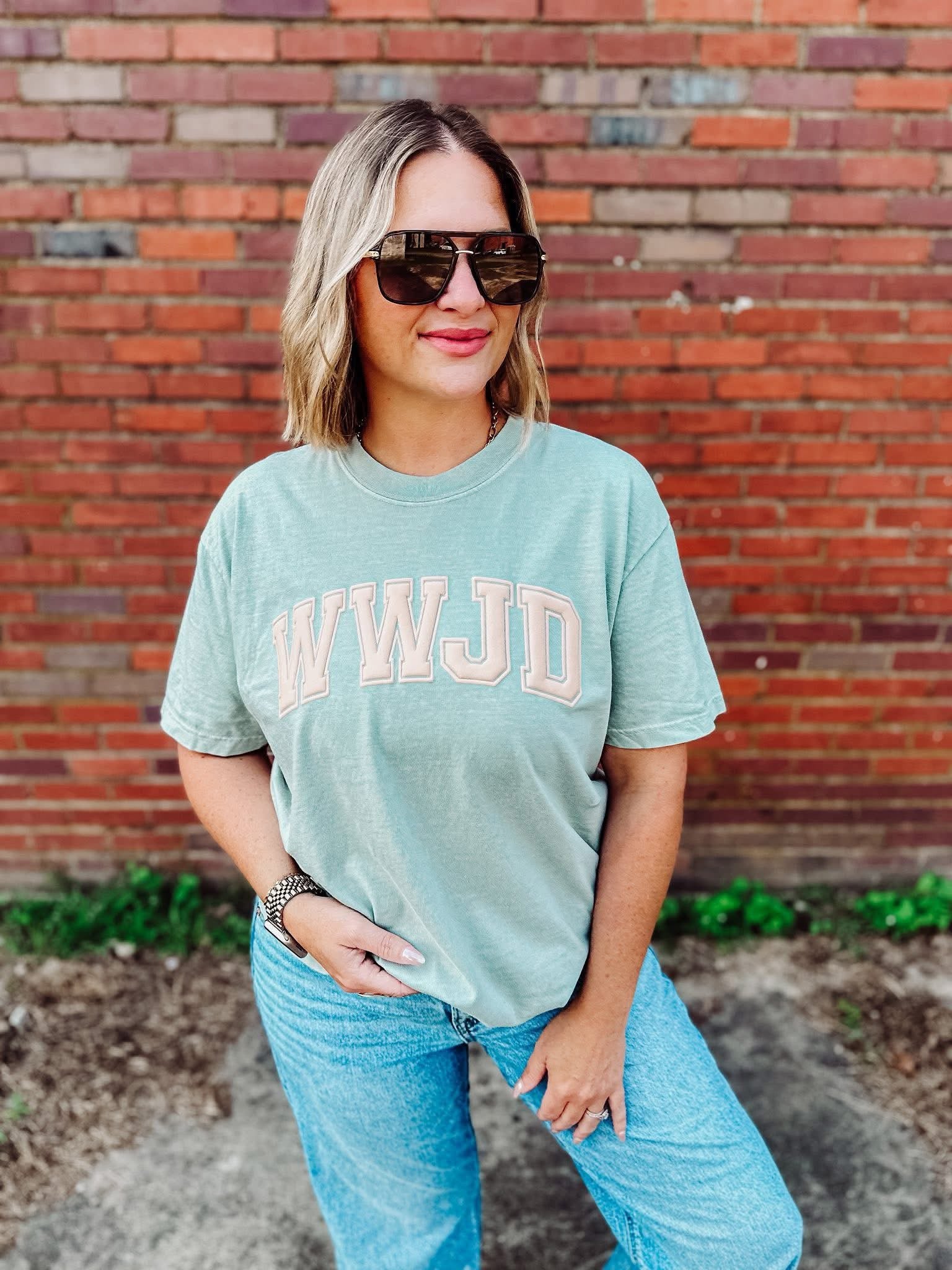 The WWJD Puff Ink Tee showcases a refined seafoam hue complemented by peach puff ink lettering. This combination offers a subtle yet distinctive aesthetic, with the raised ink providing tactile depth and visual interest. Ideal for those seeking a sophisticated casual look that thoughtfully blends color and texture.
