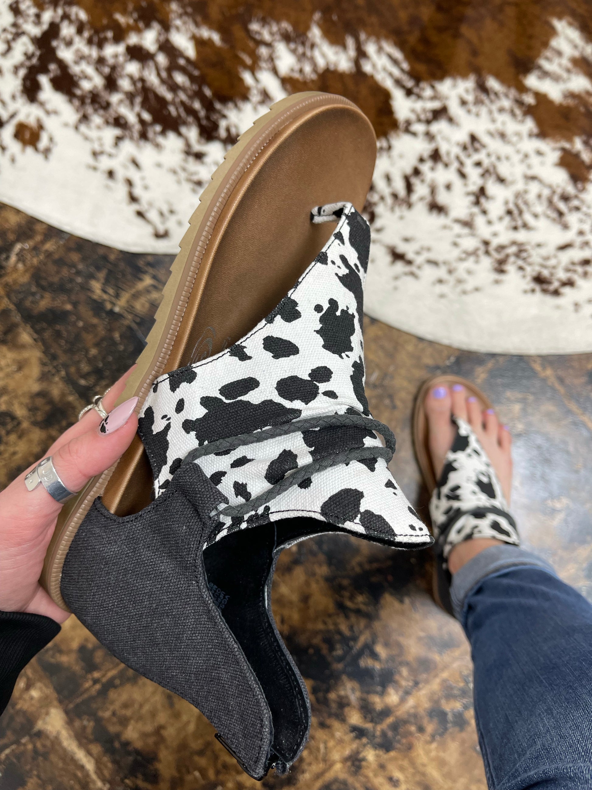 The hottest sandal of the year! These awesome sandals feature a black & white cowprint canvas upper with a braided look crossover accent and a black zippered back.