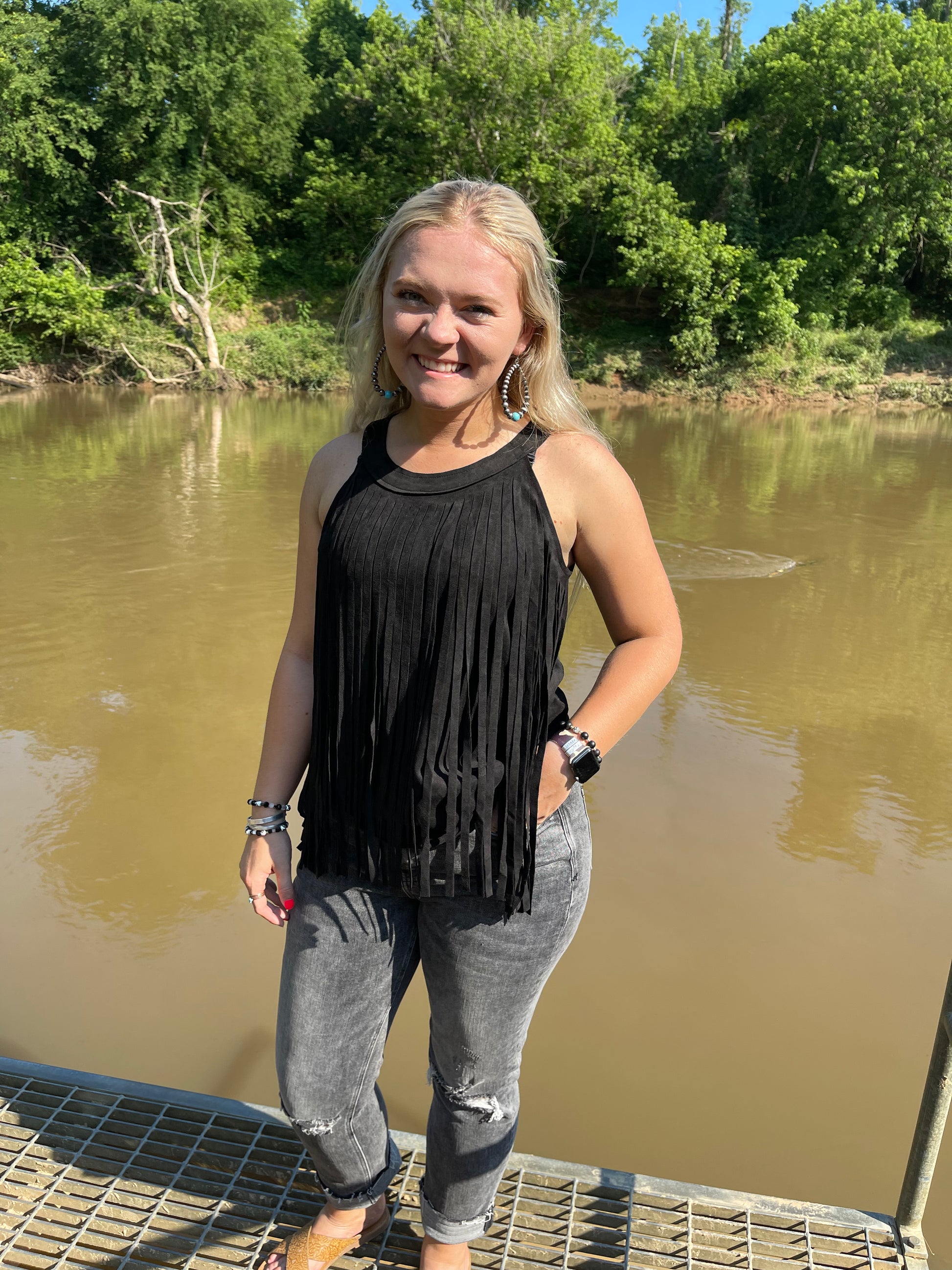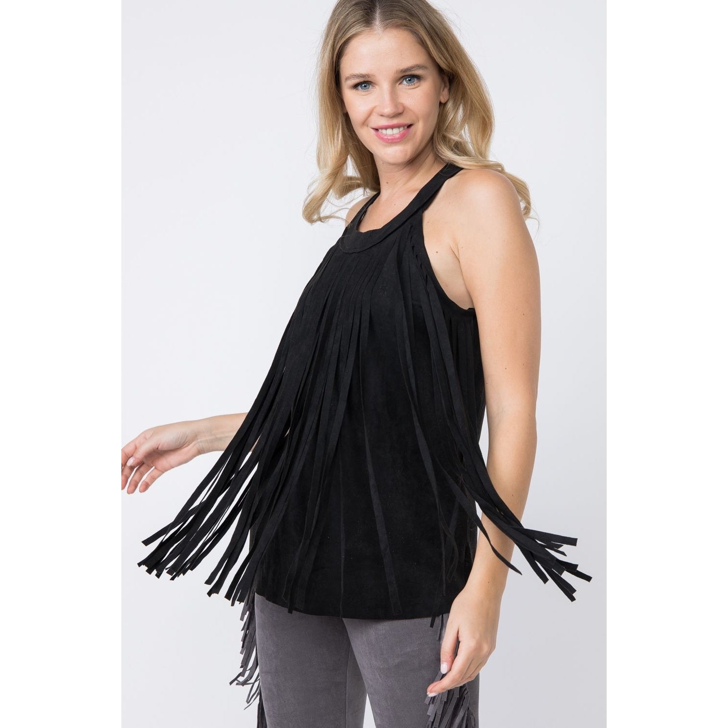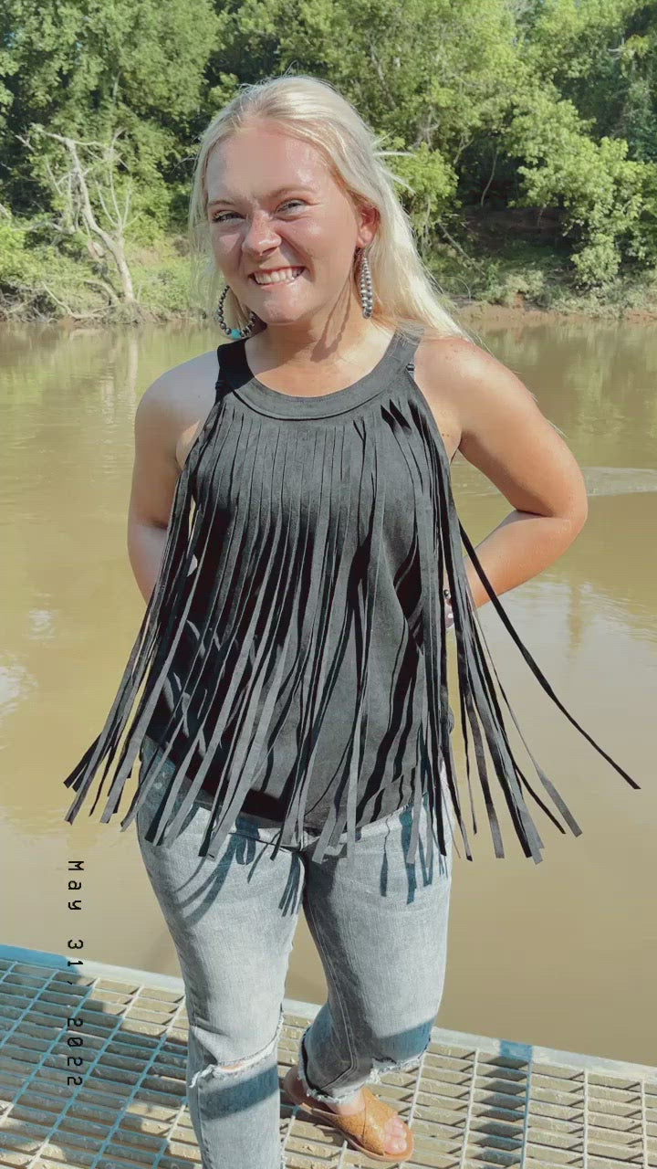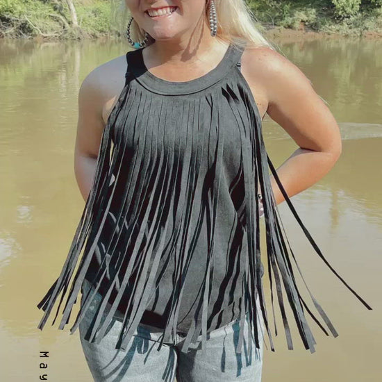 Hey Cowgirl! Have some fun in this darling fringed sleeveless top! This playful faux suede top is part of our Nashville Country Collection and features full length layered fringe in the front with a racerback look in the back.