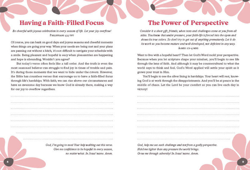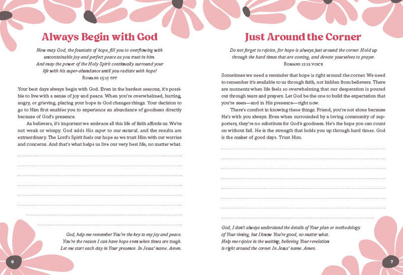 Good days have many things in common: joy, blessings, wonder, delight, contentment. . .but the very best days are those that include God in the details. Your Best Day Devotional Journal provides much-needed encouragement and inspiration for your soul. With each turn of the page, you will encounter a lovely design alongside faith-building, biblically based devotions and related scripture selections. Touching on topics like stress, joy, emotions, rest, relationships, freedom, and more, these 180 readings will help you discover that your very best day always begins—and ends—in conversation with your heavenly Father.